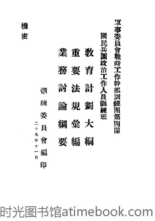 | 网盘路径:/时光图书馆珍藏系列/书籍文件/老图书/《军事委员会战时工作干部训练团第四团国民兵团政治工作人员训练班教育计划大纲,重要规则汇编,业务讨论纲要》电子版合集.db | ||