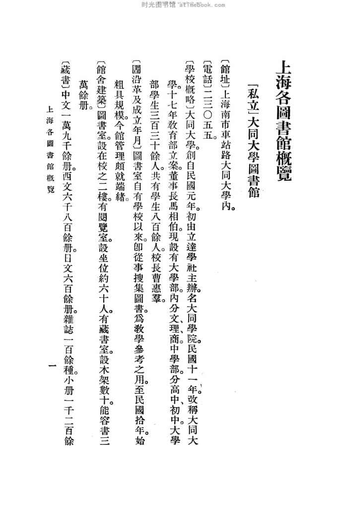| 网盘路径:/时光图书馆珍藏系列/书籍文件/老图书/《上海各图书馆概览》电子版合集.db | ||