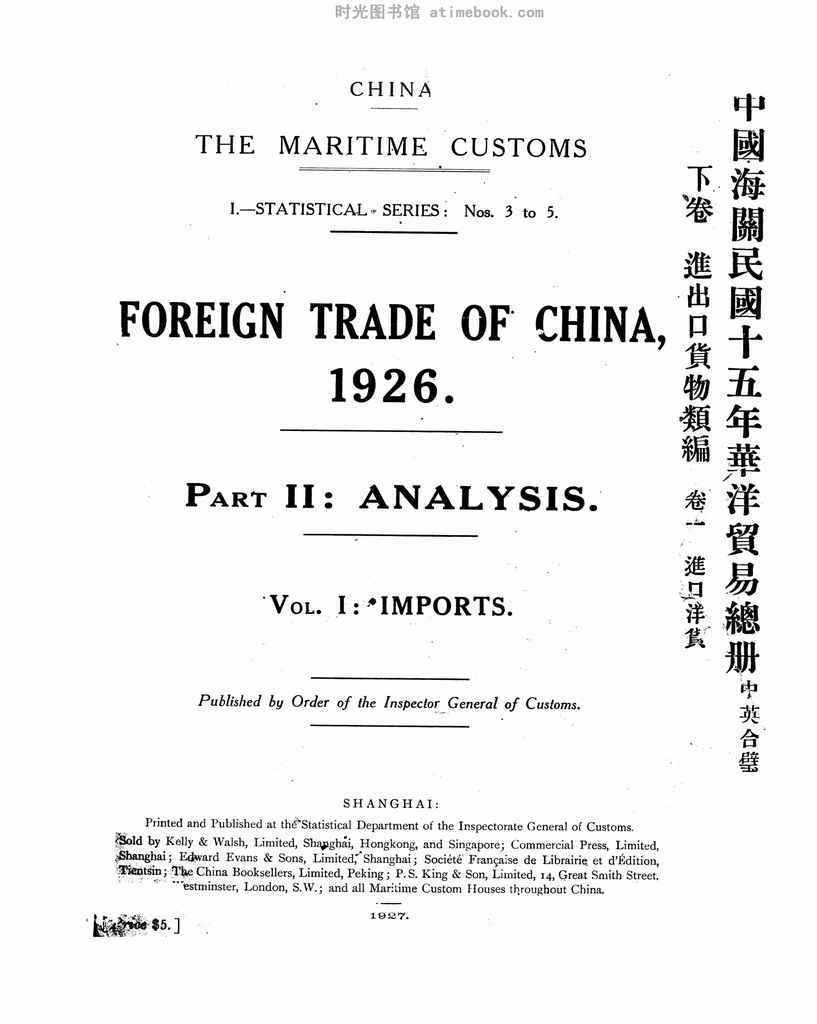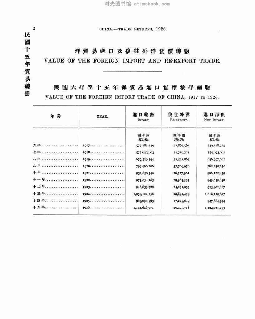 | 网盘路径:/时光图书馆珍藏系列/书籍文件/老图书/《中国海关民国十五年华洋贸易总册_下卷_进出口货物类编_卷1_进口洋货》电子版合集.db | ||