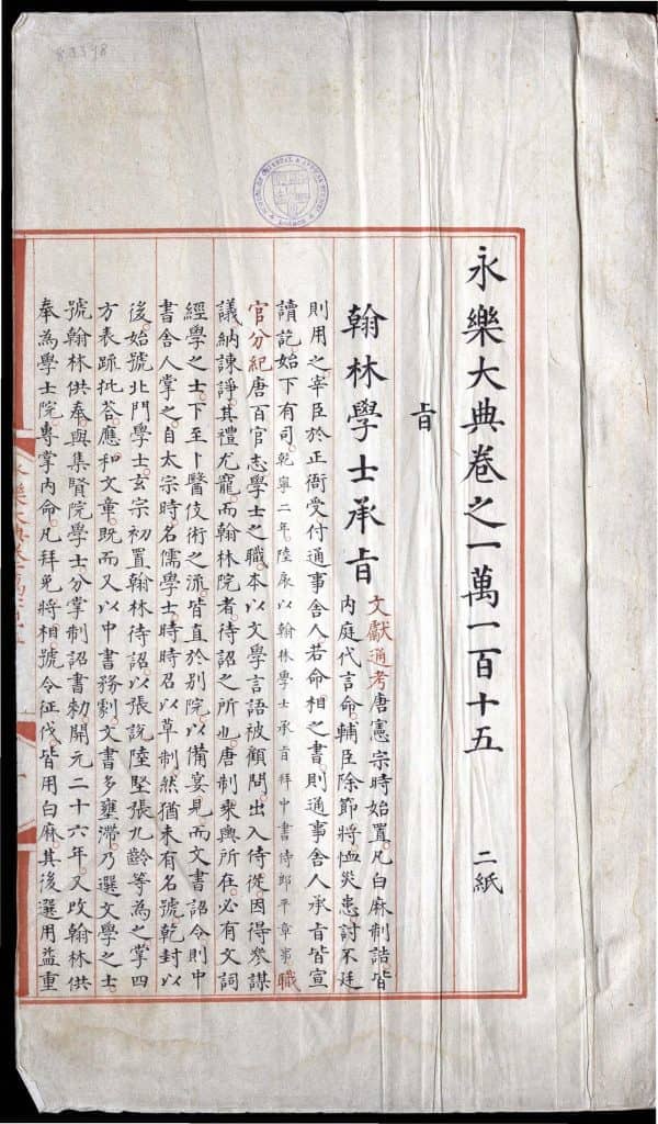 │ 永乐大典.卷14949.妇字.卷20373(原题作20573).积字.两册.明嘉靖隆庆间内府重写本.普林斯顿大学图书馆藏