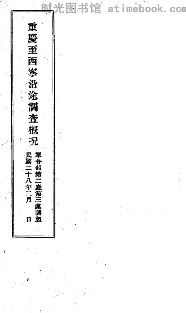 | 网盘路径:/时光图书馆珍藏系列/书籍文件/老图书/《重庆至西宁沿途调查概况》电子版合集.db | ||