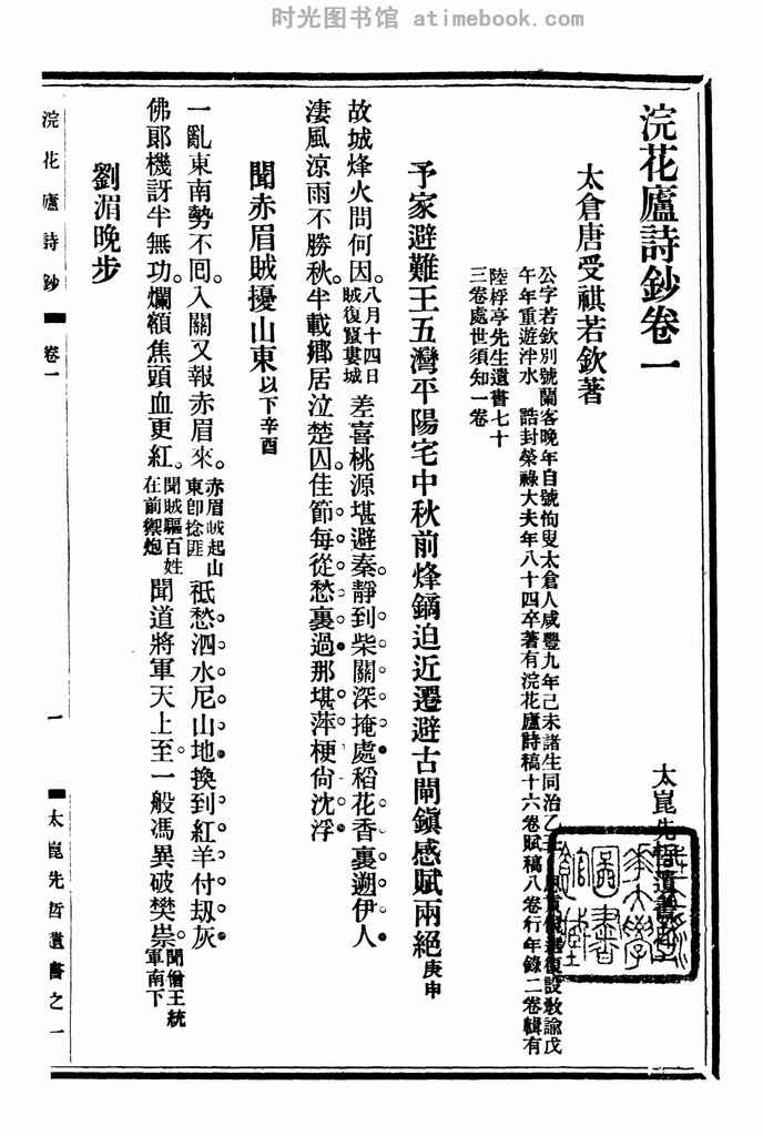 | 网盘路径:/时光图书馆珍藏系列/书籍文件/老图书/《浣花庐诗钞》电子版合集.db | ||