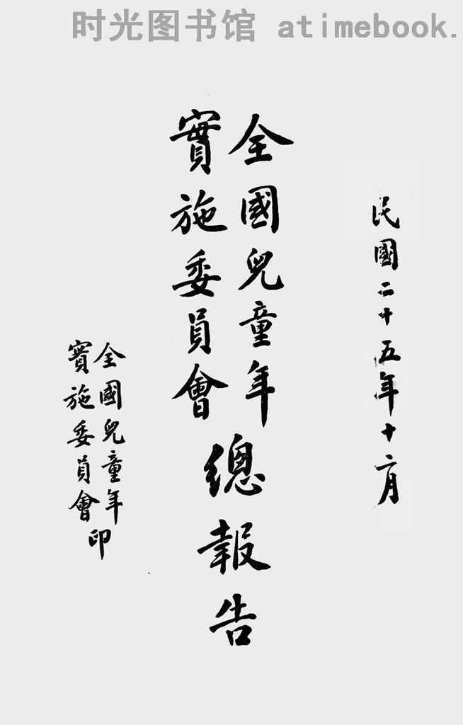 | 网盘路径:/时光图书馆珍藏系列/书籍文件/老图书/《全国儿童年实施委员会总报告》电子版合集.db | ||