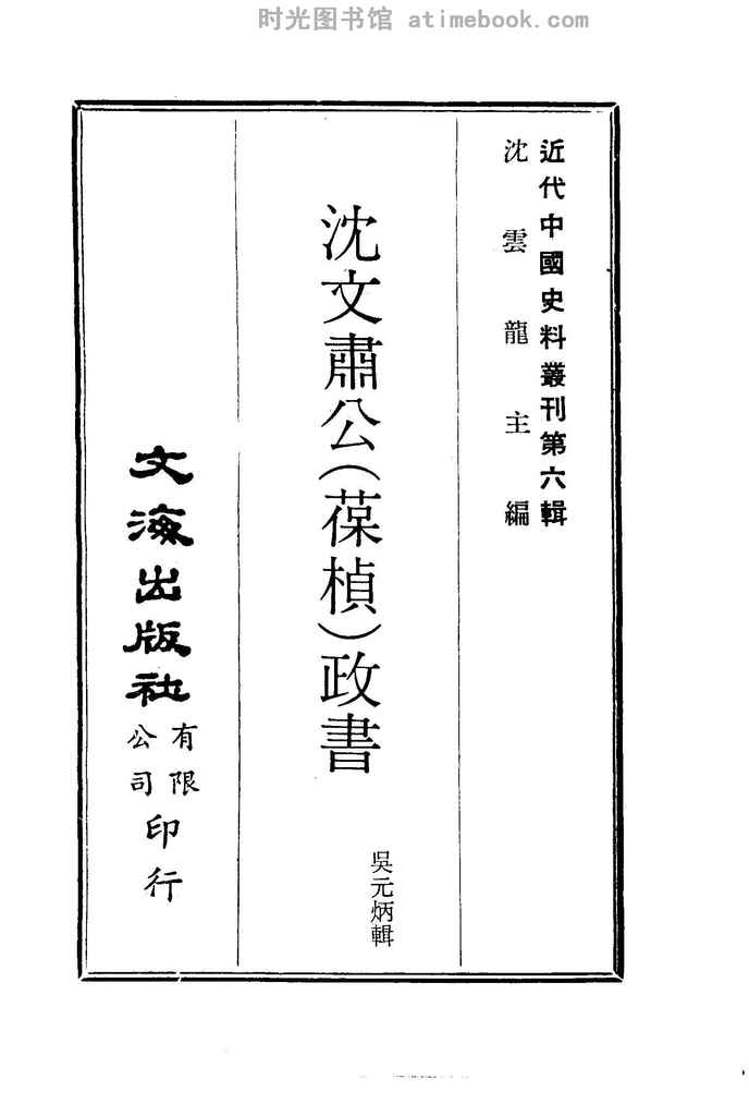 | 网盘路径:/时光图书馆珍藏系列/书籍文件/老图书/《沈文肃公(葆桢)政书》电子版合集.db | ||