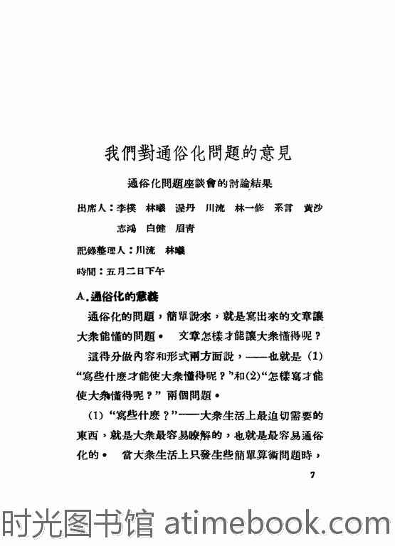 | 网盘路径:/时光图书馆珍藏系列/书籍文件/老图书/《通俗化问题讨论集_第一集》电子版合集.db | ||