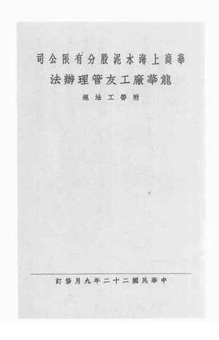 | 网盘路径:/时光图书馆珍藏系列/书籍文件/老图书/《华商上海水泥股分有限公司龙华厂工友管理办法》电子版合集.db | ||