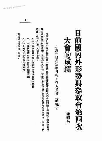 | 网盘路径:/时光图书馆珍藏系列/书籍文件/老图书/《目前国内外形势与参政会第四次大会的成绩》电子版合集.db | ||