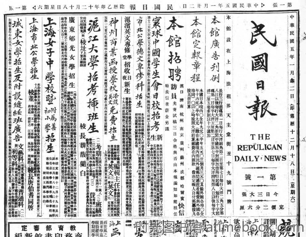 1916年1月22日,以讨袁为主旨的《民国日报》在上海创刊。该报是中华**在国内的主要言论阵地,创始人是中华**总务部长陈其美,主编为叶楚伧、邵力子、主要撰稿人有戴季陶、沈玄庐等。