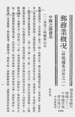 | 网盘路径:/时光图书馆珍藏系列/书籍文件/老图书/《邮务业概况(研究职业分析之一)》电子版合集.db | ||