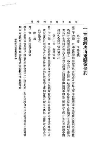 2-一、节录解决山东悬案条约(邮电)节录第十节第二十六条第十一条第二十七条附约第二条中日代表会议记录中之协定条件一、第一条及五、第十二十三条