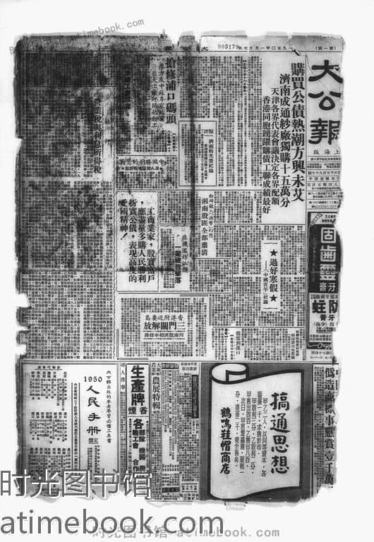 | 网盘路径:/时光图书馆珍藏系列/书籍文件/老报纸/上海/《大公报》(上海)1936-1952/《大公报》上海1950年影印版合集.db | ||