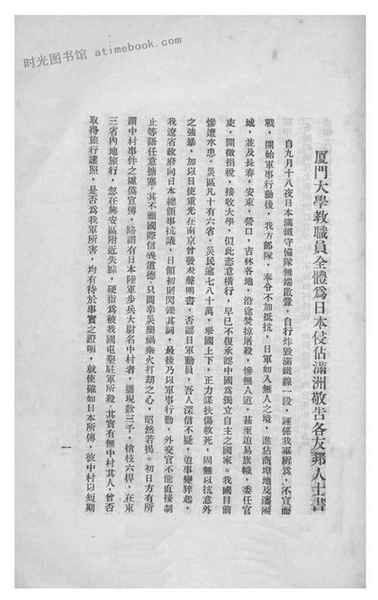 | 网盘路径:/时光图书馆珍藏系列/书籍文件/老图书/《厦门大学教职员全体为日本侵占满洲敬告各友邦人士书》电子版合集.db | ||