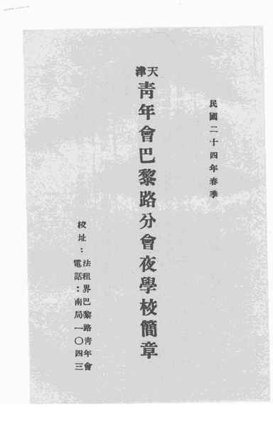 | 网盘路径:/时光图书馆珍藏系列/书籍文件/老图书/《天津青年会巴黎路分会夜学校简章》电子版合集.db | ||