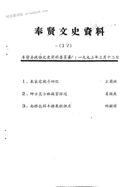 | 网盘路径:/时光图书馆珍藏系列/书籍文件/老图书/《奉贤文史资料(17)》电子版合集.db | ||