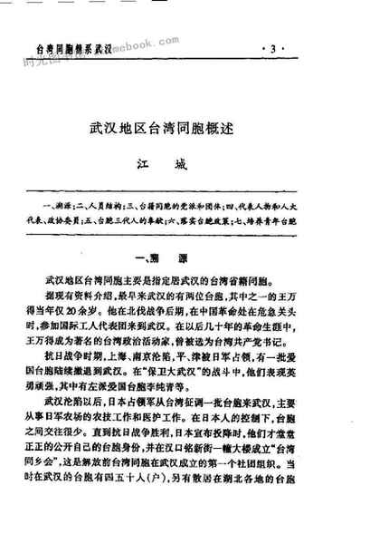 | 网盘路径:/时光图书馆珍藏系列/书籍文件/老图书/《武汉文史资料_1997年第3辑_总第69辑(台湾同胞情系武汉)》电子版合集.db | ||