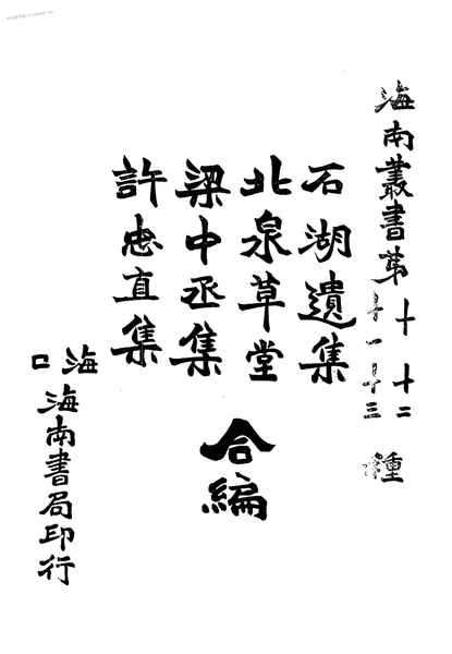| 关键词:石湖遗集,北泉草堂,梁中丞集,许忠直集,合编, | ||