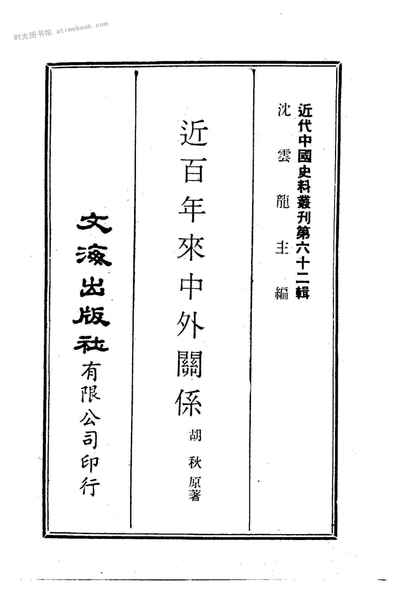 | 网盘路径:/时光图书馆珍藏系列/书籍文件/老图书/《近代中国史料丛刊第六十二辑_近百年来中外关系》电子版合集.db | ||