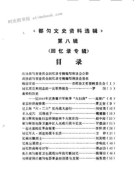 | 网盘路径:/时光图书馆珍藏系列/书籍文件/老图书/《都匀文史资料选辑_第8辑_(回忆录专辑)》电子版合集.db | ||