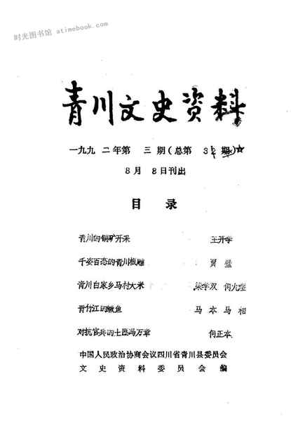 | 网盘路径:/时光图书馆珍藏系列/书籍文件/老图书/《青川县文史资料1992年第3期》电子版合集.db | ||