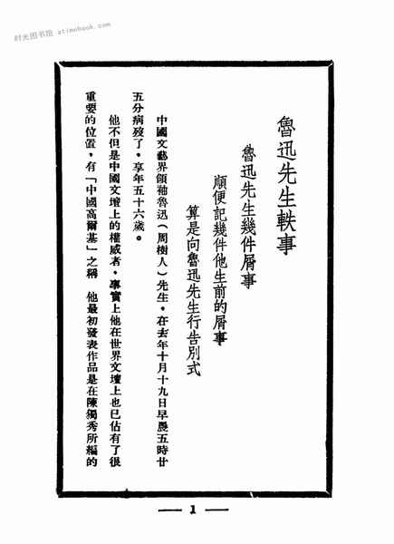 | 网盘路径:/时光图书馆珍藏系列/书籍文件/老图书/《鲁迅先生轶事》电子版合集.db | ||