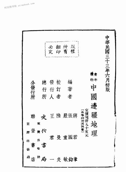 | 网盘路径:/时光图书馆珍藏系列/书籍文件/老图书/《中国边疆地理》电子版合集.db | ||