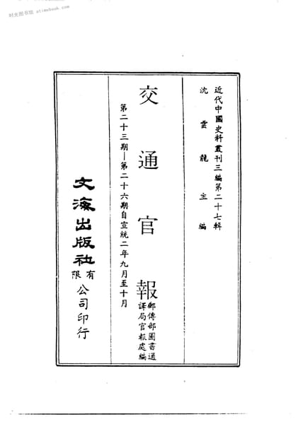 | 网盘路径:/时光图书馆珍藏系列/书籍文件/老图书/《交通官報(第二十三-二十六期自宣統2年九-十月)》电子版合集.db | ||