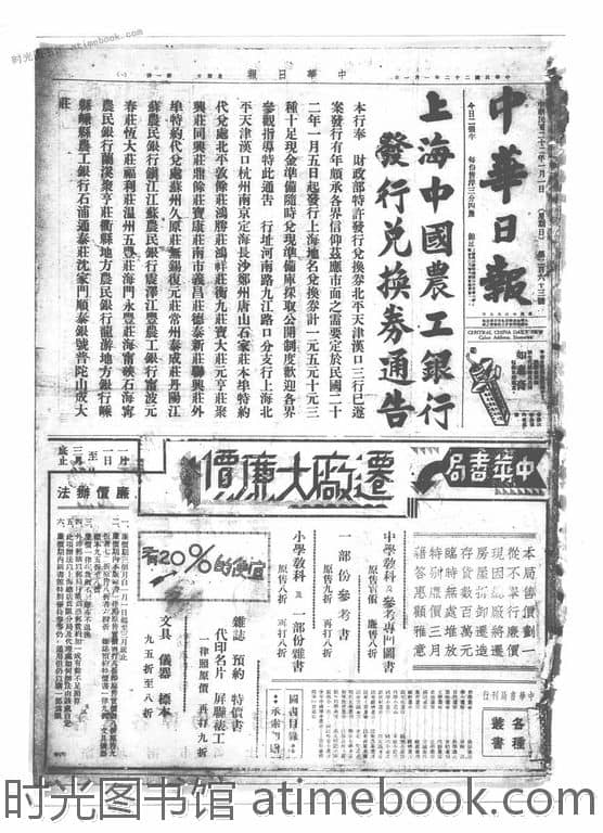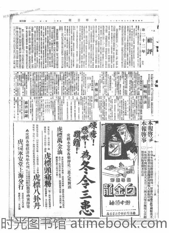 | 网盘路径:/时光图书馆珍藏系列/书籍文件/老报纸/上海/《中华日报》(上海)1928-1945/《中华日报》(上海)1933年影印版合集.db | ||