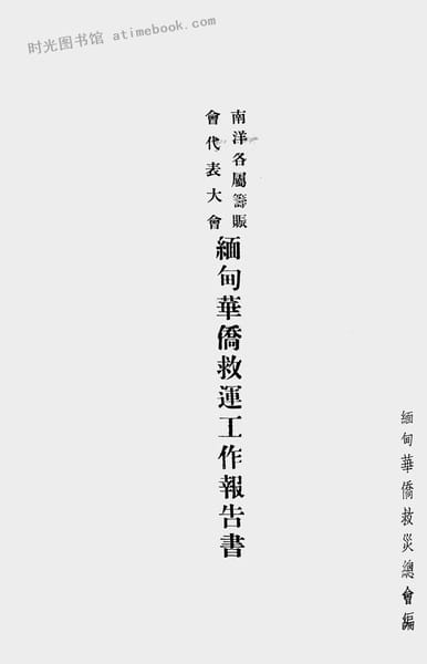 | 网盘路径:/时光图书馆珍藏系列/书籍文件/老图书/《南洋各属筹赈会代表大会缅甸华侨救运工作报告书》电子版合集.db | ||