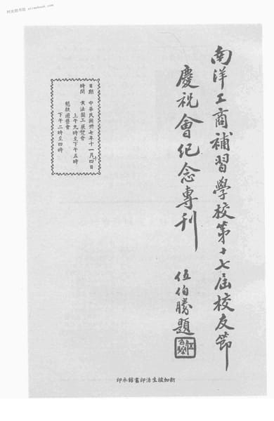 | 网盘路径:/时光图书馆珍藏系列/书籍文件/老图书/《南洋工商补习学校第十七届校友节庆祝会纪念专刊》电子版合集.db | ||