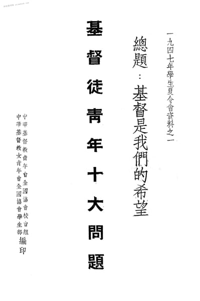 | 网盘路径:/时光图书馆珍藏系列/书籍文件/老图书/《基督徒青年十大问题》电子版合集.db | ||