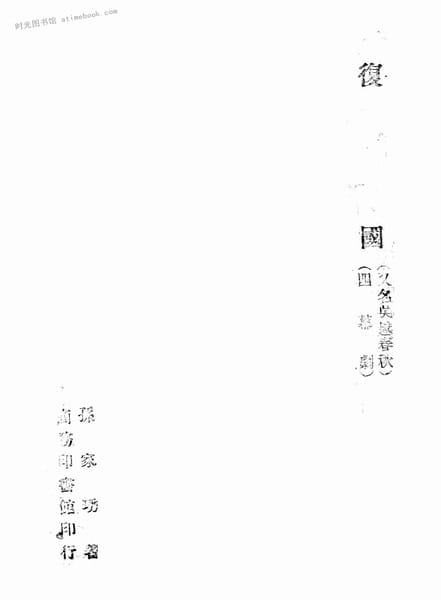 | 网盘路径:/时光图书馆珍藏系列/书籍文件/老图书/《复国(四幕剧)》电子版合集.db | ||