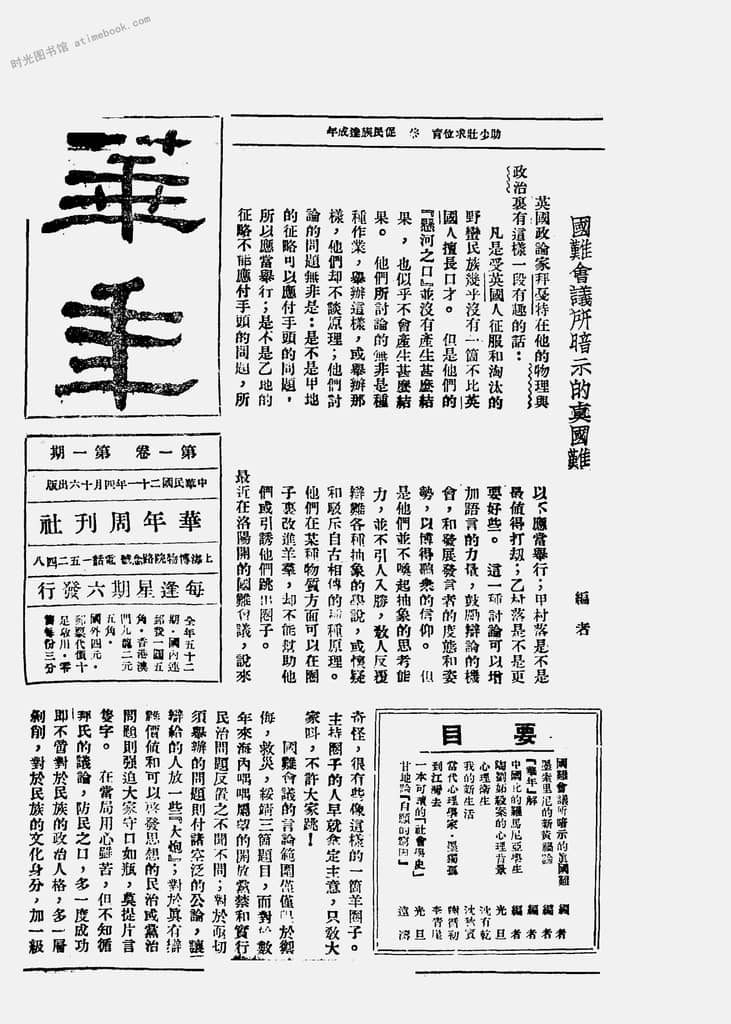 | 网盘路径:/时光图书馆珍藏系列/书籍文件/老杂志、老期刊/民国期刊/上海/《华年》(上海)1932-1937年合集.db | ||