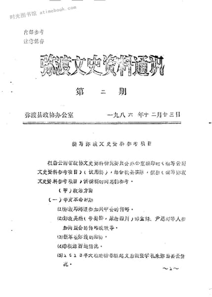 | 网盘路径:/时光图书馆珍藏系列/书籍文件/老图书/《弥渡文史资料通讯_第2辑》电子版合集.db | ||