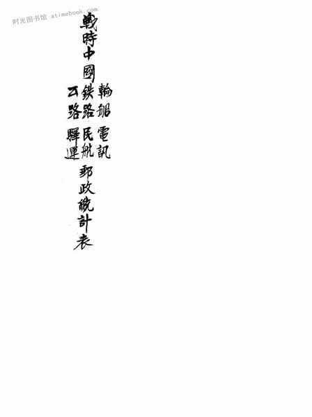 | 网盘路径:/时光图书馆珍藏系列/书籍文件/老图书/《战时中国轮船铁路公路电讯民航驿运邮政统计表》电子版合集.db | ||