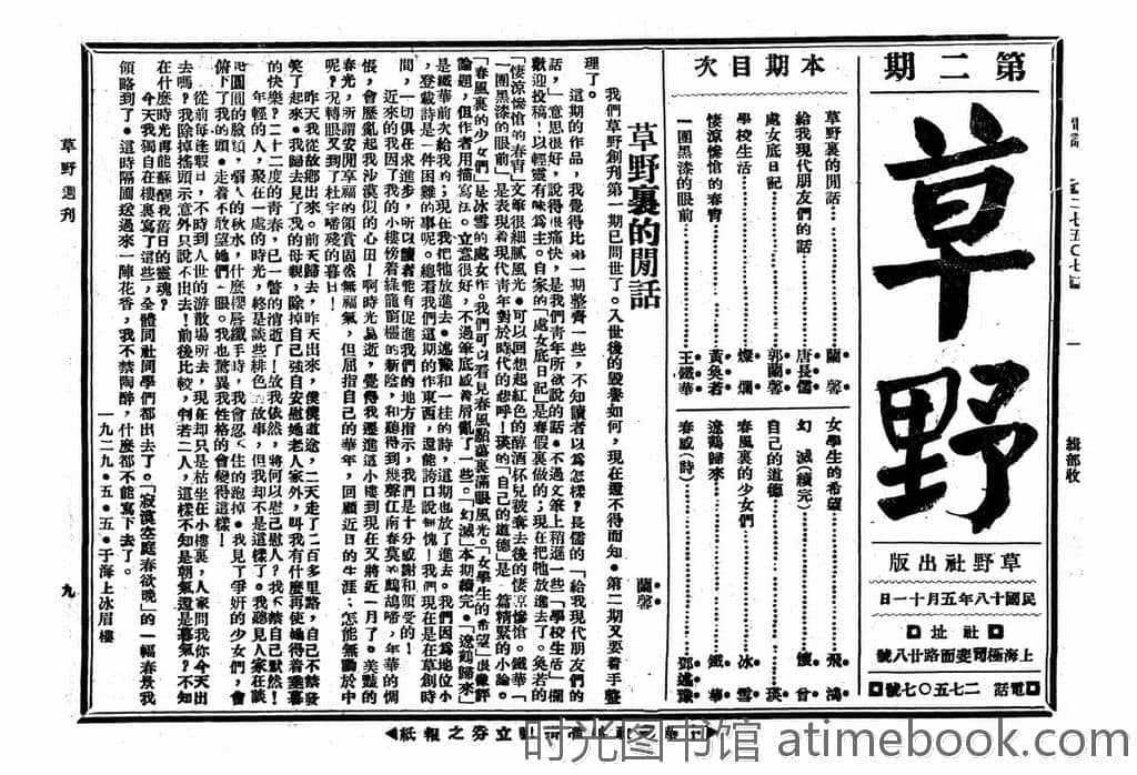 网盘路径:/时光图书馆珍藏系列/书籍文件/老杂志、老期刊/民国期刊/上海/《草野》(上海)1929-1931年合集.db