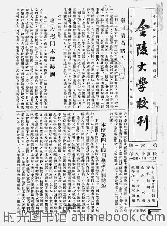 | 网盘路径:/时光图书馆珍藏系列/书籍文件/老杂志、老期刊/《金陵大学校刊》1939-1946年合集.db | ||