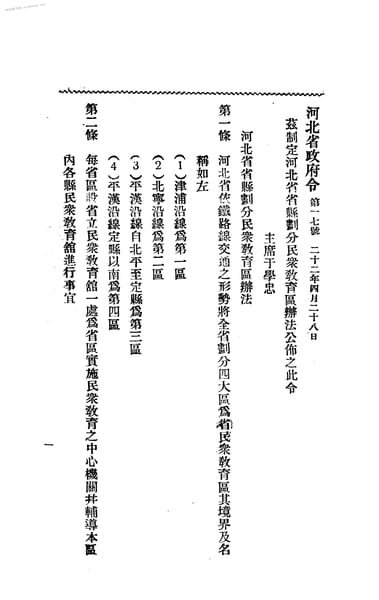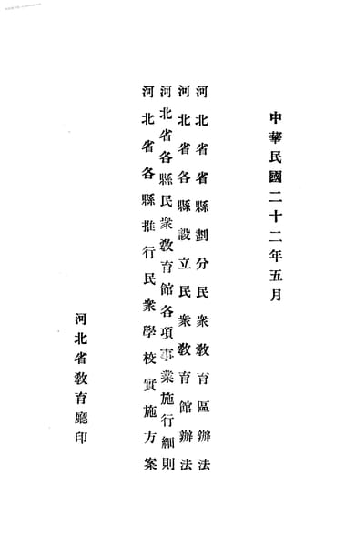 名称:《河北省省县划分民众教育区办法_河北省各县设立民众教育馆办法_河北省各县民众教育馆各项事业施行细则_河北省各县推行民众学校实施方案》电子版合集