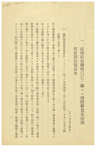 2-一、帝國*聲明ニ關スル國際聯盟及帝國*間往復公文(十一月七日發表)