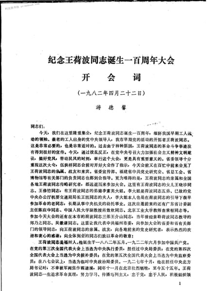 2-纪念王荷波同志诞生一百周年大会开会词(一九八二年四月二十二日)*福州市委副书记游德馨