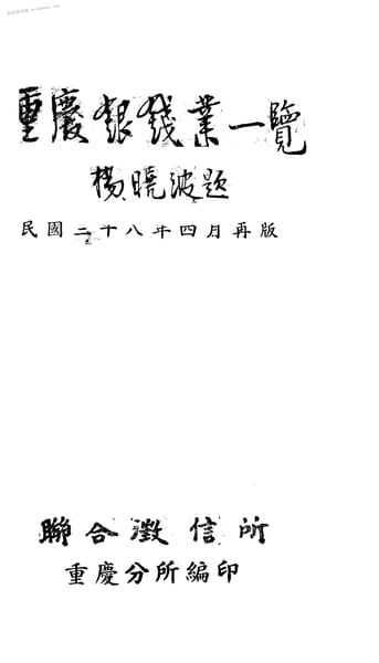 | 网盘路径:/时光图书馆珍藏系列/书籍文件/老图书/《重庆银钱业一览》电子版合集.db | ||
