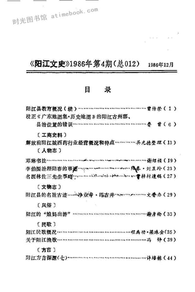 网盘路径:/时光图书馆珍藏系列/书籍文件/老图书/《阳江文史_1986第4期_总012期》电子版合集.db