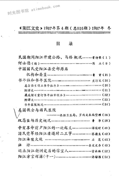 | 网盘路径:/时光图书馆珍藏系列/书籍文件/老图书/《阳江文史_1987第4期_总016期》电子版合集.db | ||