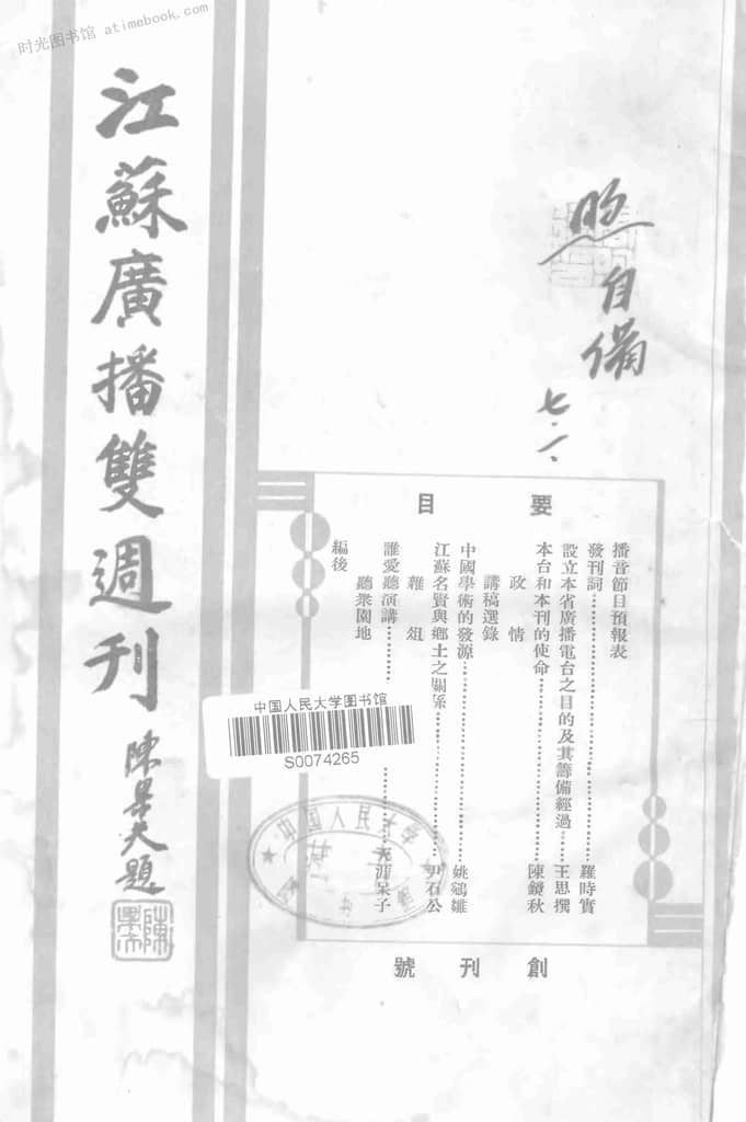 | 网盘路径:/时光图书馆珍藏系列/书籍文件/老杂志、老期刊/民国期刊/江苏/《江苏广播双周刊》1935-1936年合集.db | ||