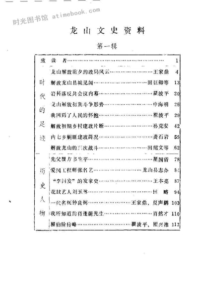 | 网盘路径:/时光图书馆珍藏系列/书籍文件/老图书/《龙山文史资料__第1辑》电子版合集.db | ||