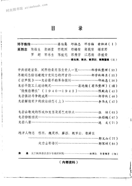 | 网盘路径:/时光图书馆珍藏系列/书籍文件/老图书/《龙岩文史资料_第5期》电子版合集.db | ||