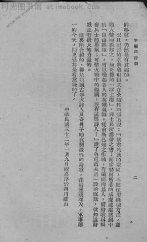 | 网盘路径:/时光图书馆珍藏系列/书籍文件/老图书/《军国民诗话》电子版合集.db | ||
