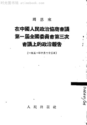 | 网盘路径:/时光图书馆珍藏系列/书籍文件/老图书/《周恩来在中国人民政治协商会议第一届全国委员会第三次会议上的政治报告_1951年10月23日》电子版合集.db | ||