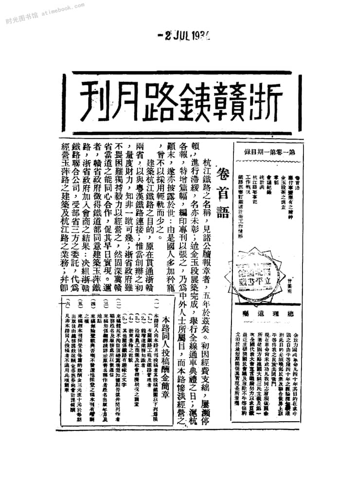 | 网盘路径:/时光图书馆珍藏系列/书籍文件/老杂志、老期刊/民国期刊/浙江/《浙赣铁路月刊》(杭州)1934-1937年合集.db | ||