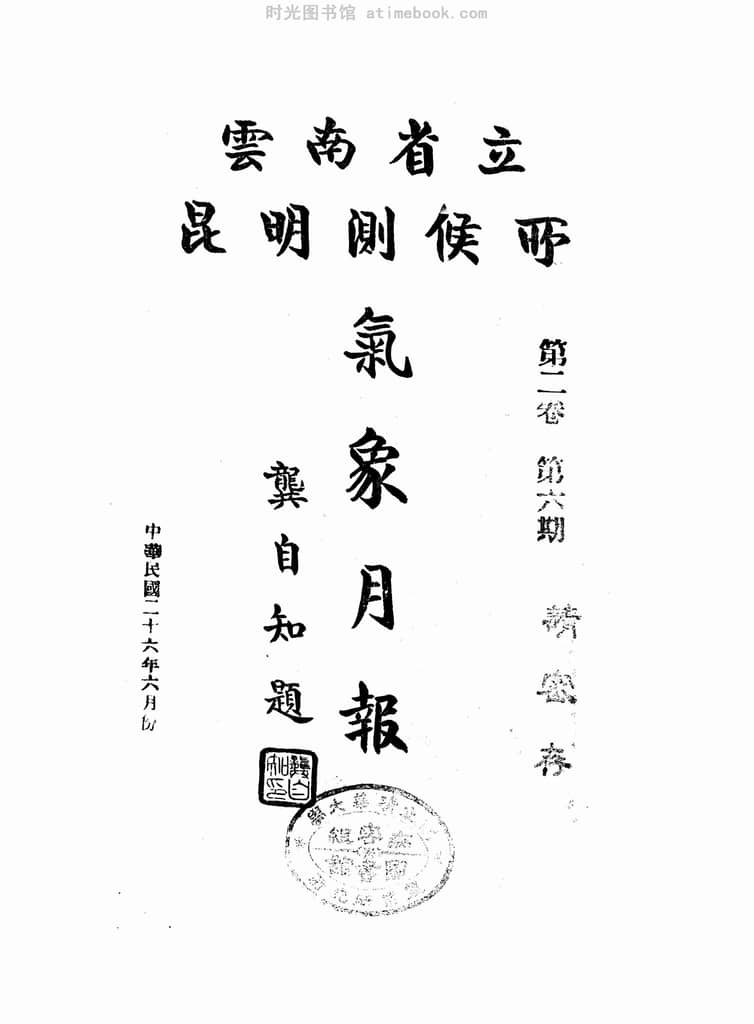 | 网盘路径:/时光图书馆珍藏系列/书籍文件/老报纸/云南/《气象月报》(昆明)1937-1939年合集.db | ||