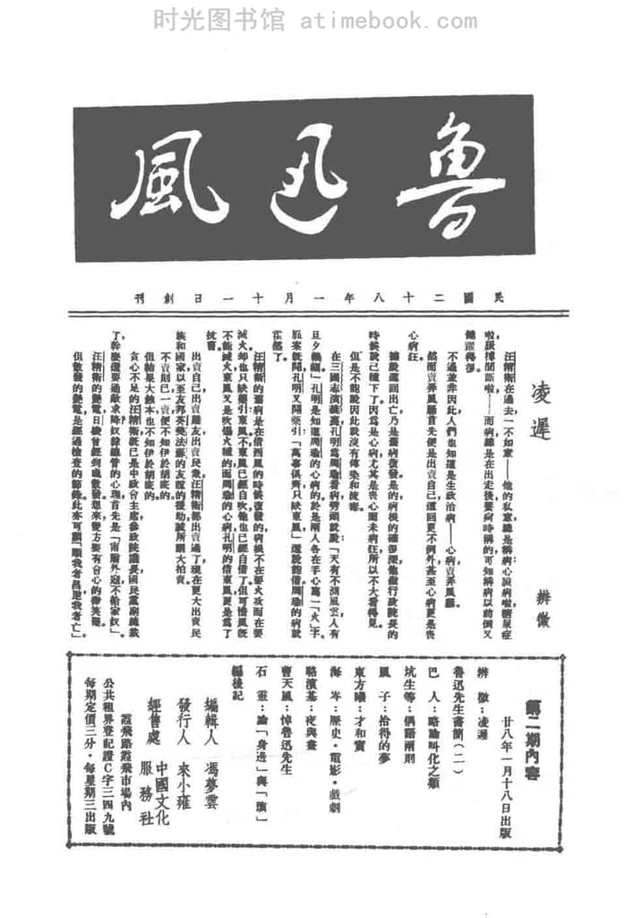 | 网盘路径:/时光图书馆珍藏系列/书籍文件/老杂志、老期刊/民国期刊/上海/《鲁迅风》(上海)1939-1939年合集.db | ||